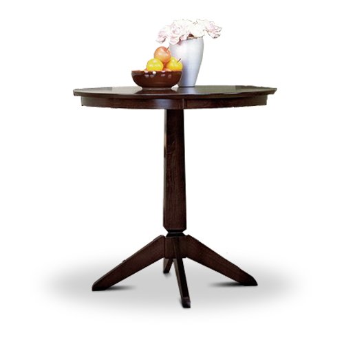 This solid wood round table measures 36" round and is 36" tall done in the rich brown stain that is so popular. It features a nice dark espresso / cappuccino finish and has four legs for stability. The top is supported by a thick pedestal support which is bolted on. Notice the siding skirt that goes around the entire underside. We also carry a selection of barstools that go with this table that can be found in our other ads. Thank you!